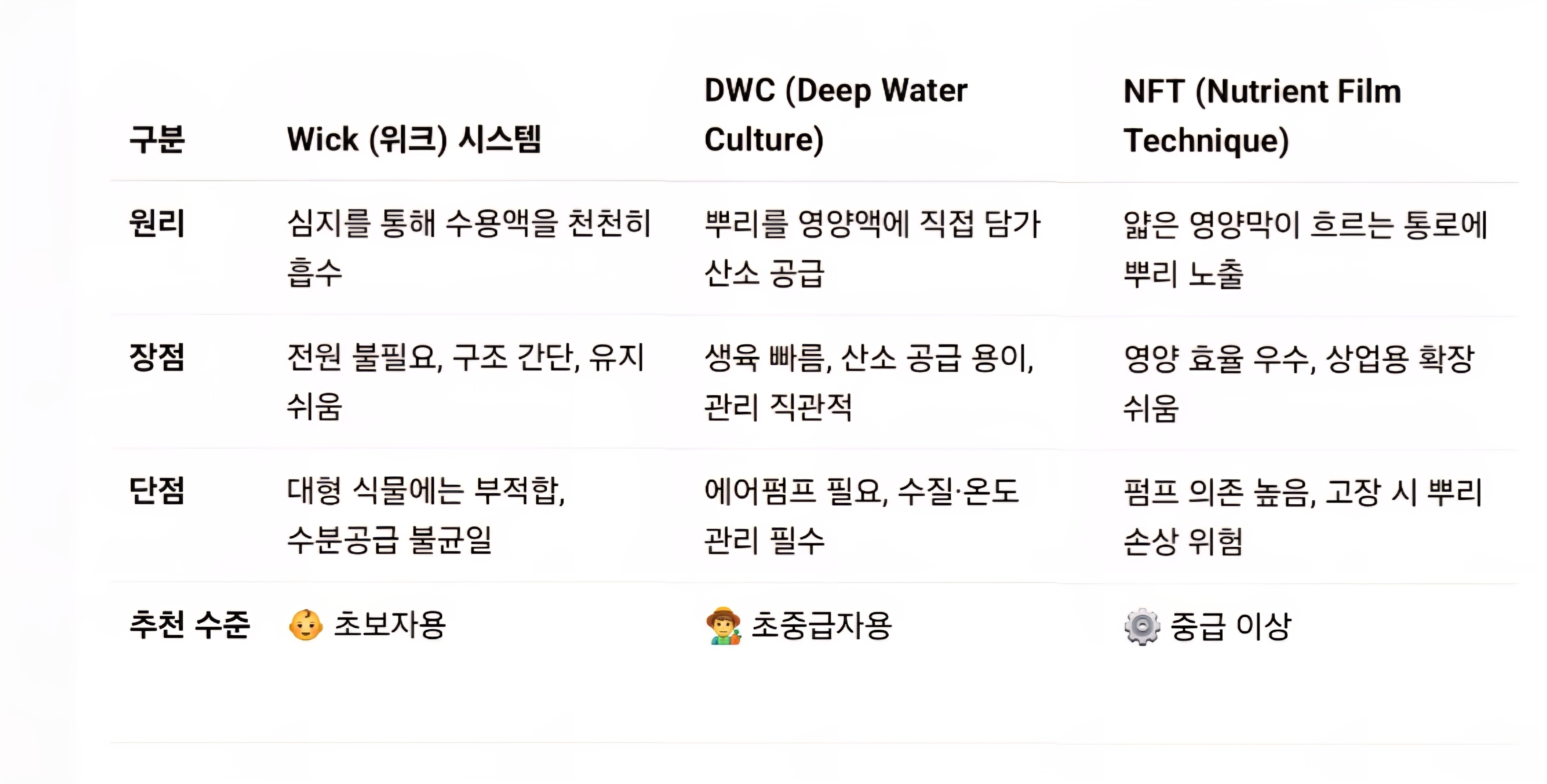 DWC(Deep Water Culture): 식물 뿌리가 저장소의 영양액에 계속 닿는 방식. 설치 쉽고 유지보수도 간단. 단, 산소 공급과 수질 관리가 중요.
