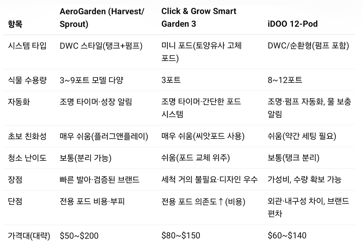 아래는 초보자용으로 널리 추천되는 AeroGarden Harvest(또는 Sprout), Click & Grow Smart Garden 3, iDOO 12-Pod를 대표로 뽑아 비교한 표입니다.