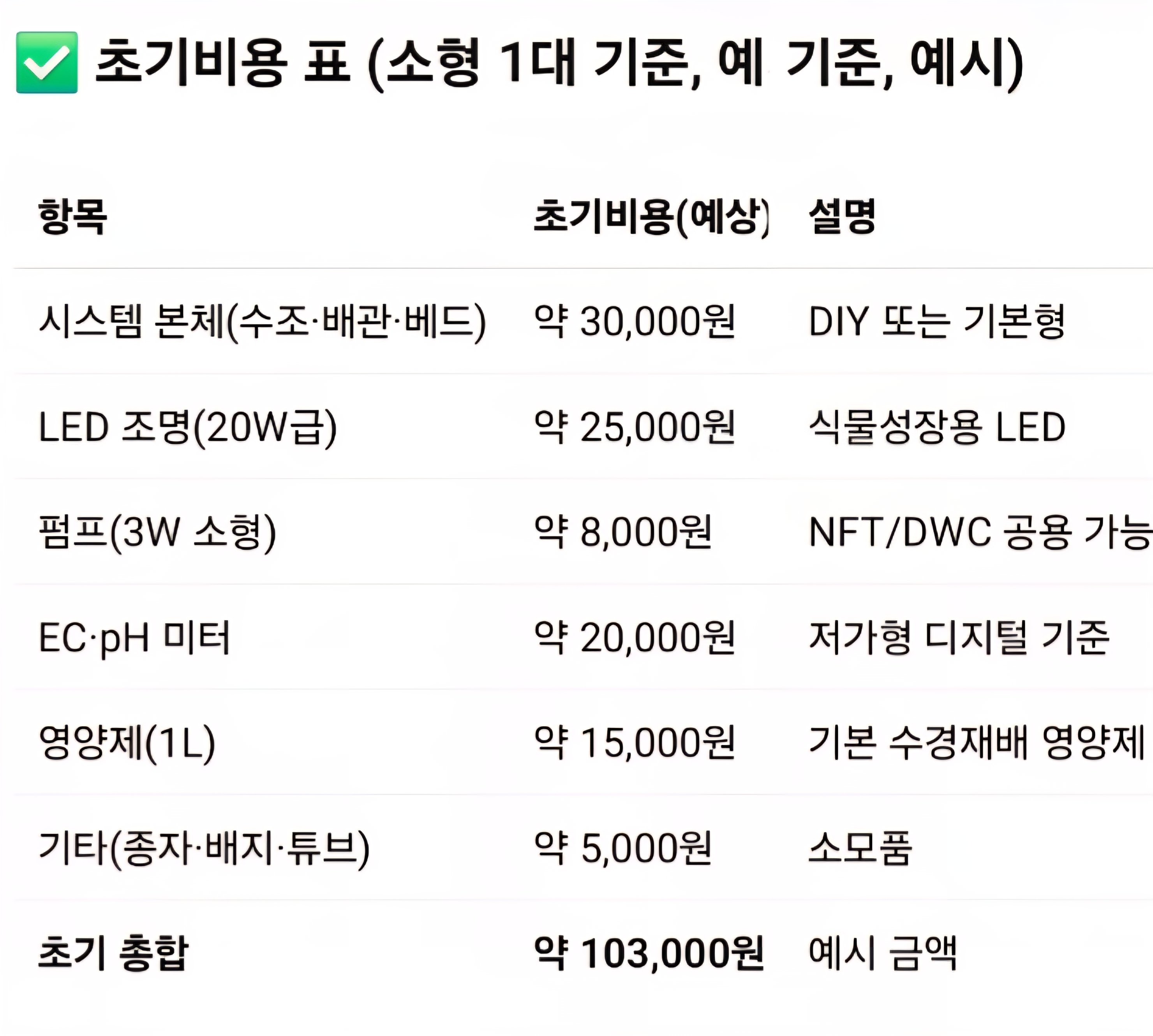 한 번에 ‘전체 금액’만 보는 것보다는, 항목별 분해가 중요합니다. 일반적으로 가정용(소형) 수경재배 초기비용 항목은 다음과 같습니다.