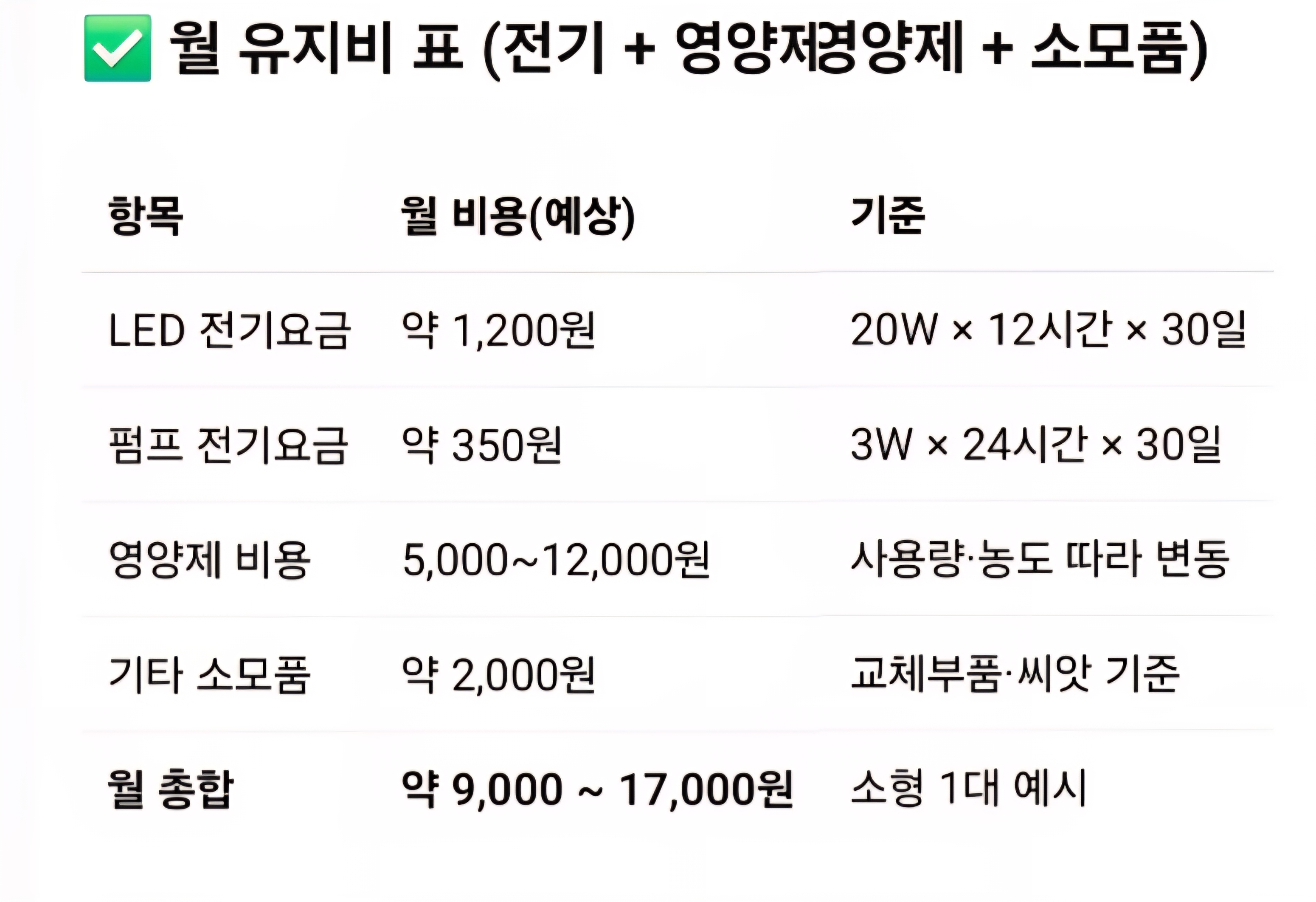 영양제(하이드로포닉스 전용): 원액 1L 단위 판매가 많고, 사용량·농도에 따라 월 비용이 달라집니다.