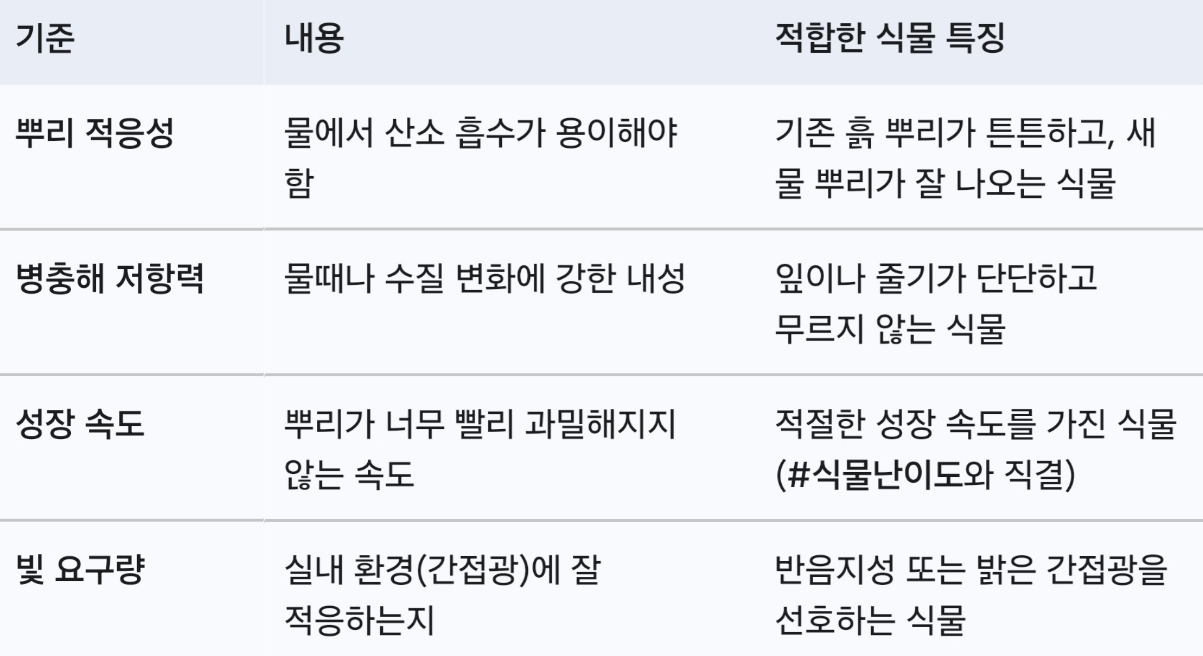 *수경재배 식물 선택 핵심 기준* (확실한 정보)