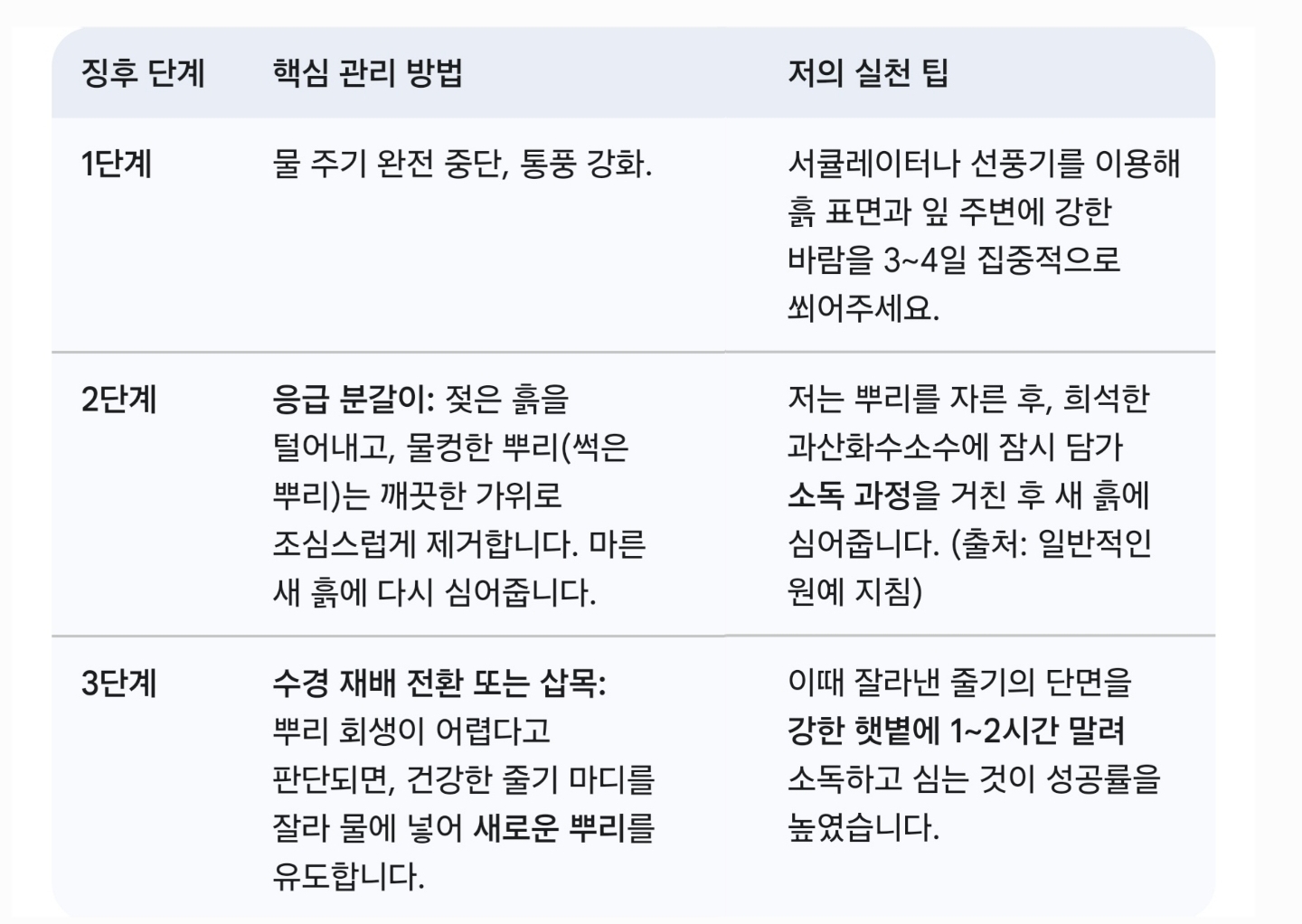 3단계 (심각): 줄기 전체가 무르고 냄새가 나며, 새로운 잎이 나오지 않거나 나오더라도 검게 변색됩니다. 이 경우 뿌리 전체가 이미 심각하게 손상되었을 가능성이 높습니다.