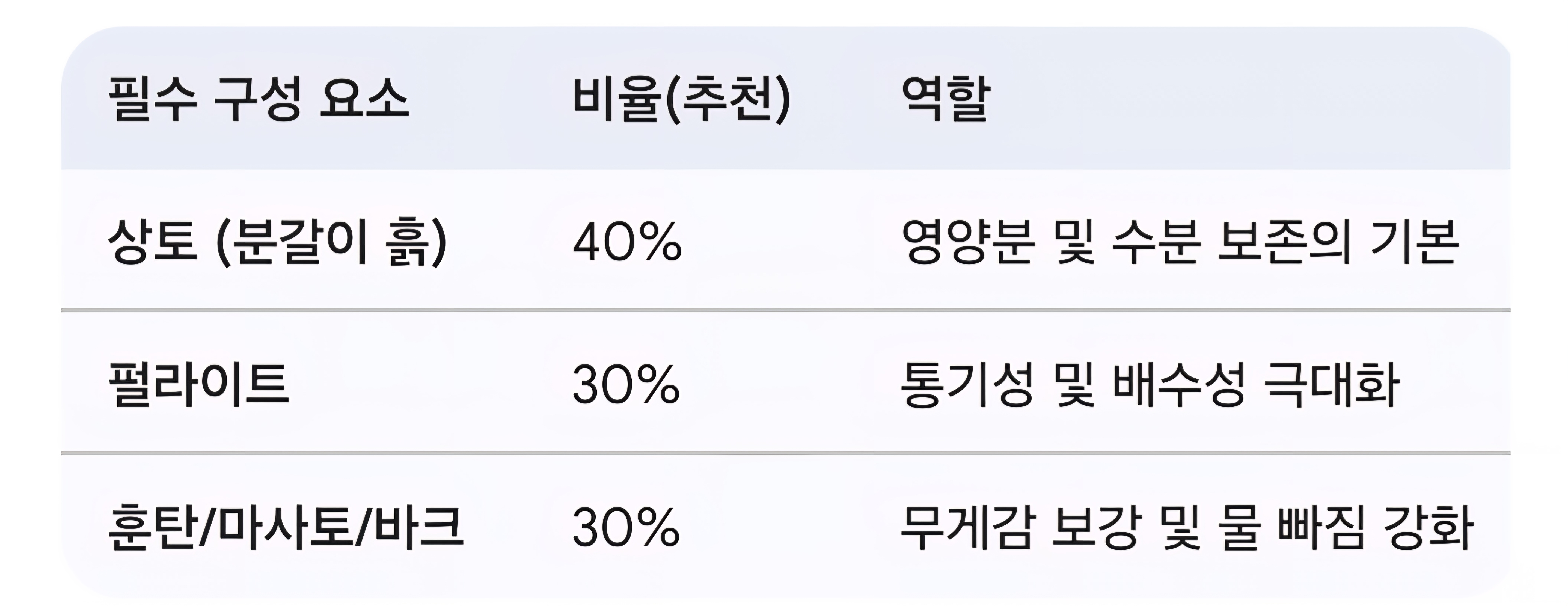 💡 저의 실천 루틴: 저는 펄라이트를 일반적인 추천 비율보다 조금 더 높여서 사용합니다. 이렇게 하면 물을 줄 때마다 '촤악'하고 물이 빠르게 빠져나가는 소리가 들리는데, 그때마다 "아, 과습 걱정은 덜었구나!" 하고 안심해요. 이처럼 가볍고 공기가 잘 통하는 에어리(Airy)한 흙 환경을 만들어 주는 것이 핵심입니다.