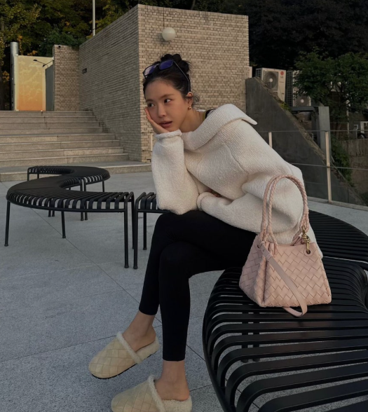 ​이 제품은 겉감에 보테가 베네타 특유의 격자무늬가 은은하게 들어가 있고, 안감은 보송보송한 시어링(양털) 소재로 덮여 있습니다. 손나은 님은 이를 블랙 레깅스와 매치해 '꾸민 듯 안 꾸민 듯'한 원마일웨어의 정석을 보여줬죠.