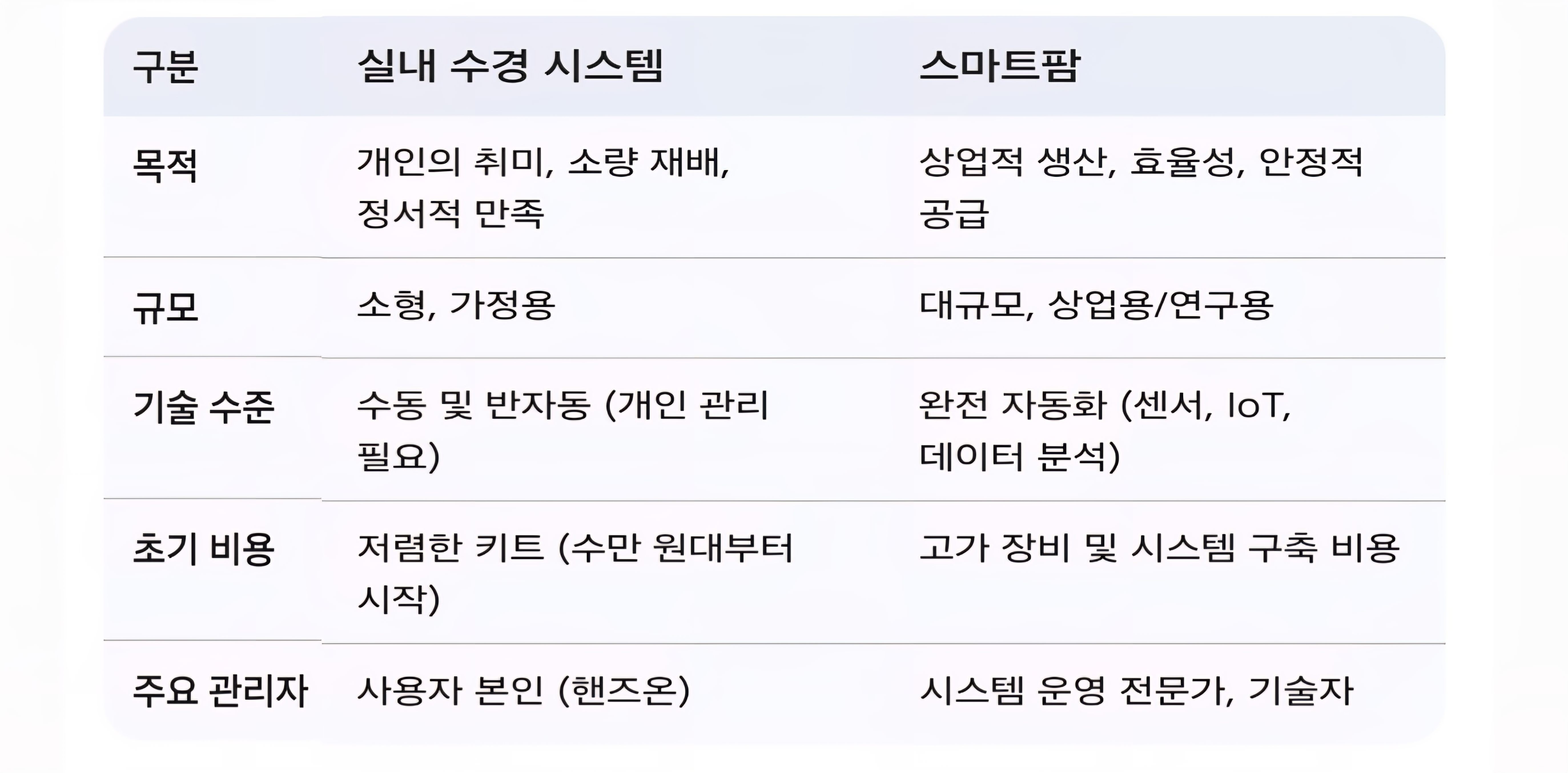 ---3. ⚖️핵심 비교 분석: 실내 수경 시스템 vs. 스마트팜, 당신의 선택은?